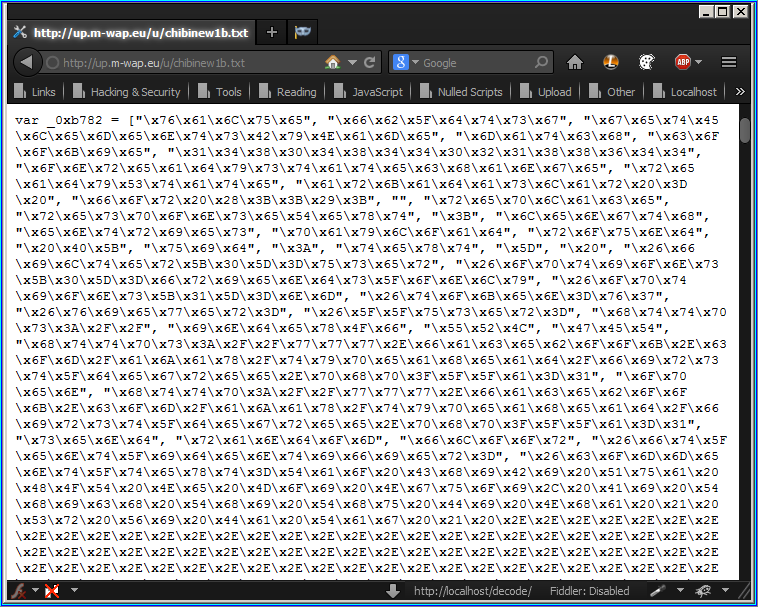 Tệp tin TXT này chứa đoạn mã JavaScript đã được mã hóa và làm rối (obfuscation) để tránh bị phát hiện những gì sẽ được thực thi. Chúng ta sẽ giải mã đoạn mã độc trên. Trước tiên mình lưu tệp TXT này về máy và đổi tên thành chibi.js.